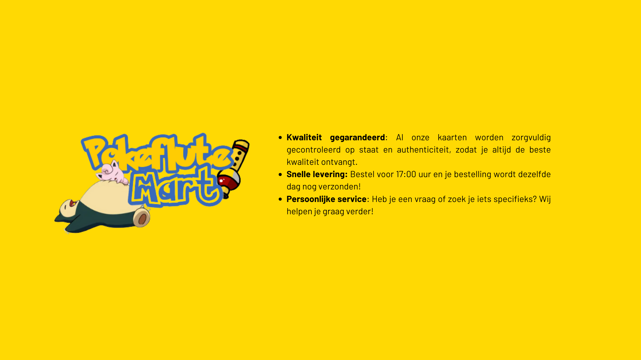 Ben jij een fan van Pokémon kaarten? Of je nu een ervaren verzamelaar bent of net begint met je avontuur, bij Pokeflutemart vind je een uitgebreide selectie van Pokémon kaarten. Wij bieden een veilige en betrouwbare winkelervaring, waar je terecht kunt voor zowel gewone kaarten en de meer zeldzame kaarten.